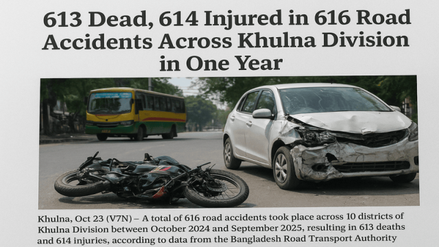 Khulna, Oct 23 (V7N) – A total of 616 road accidents took place across 10 districts of Khulna Division between October 2024 and September 2025, resulting in 613 deaths and 614 injuries, according to data from the Bangladesh Road Transport Authority (BRTA). During this period, 892 vehicles were involved in accidents—most of which were motorcycles.