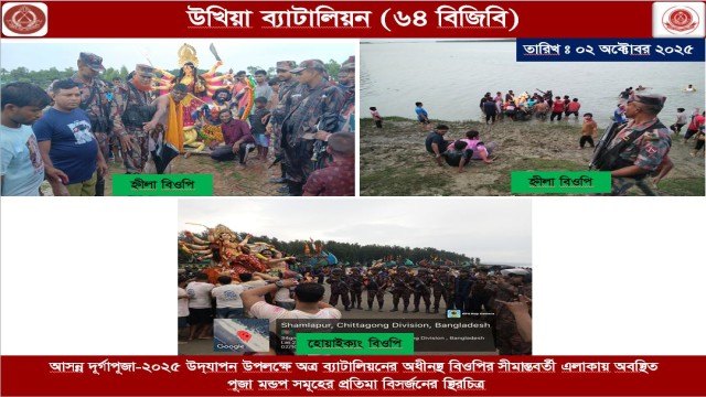 From September 24 to October 2, 64 BGB members increased security at six pandals located in the border areas while conducting intelligence monitoring and patrol operations. Following the conclusion of the celebrations on Bijoya Dashami, Hindu devotees safely immersed idols in the sea with the support of the BGB. Immersion took place at locations along Marine Drive in Baharchhara and two points along the Naf River.